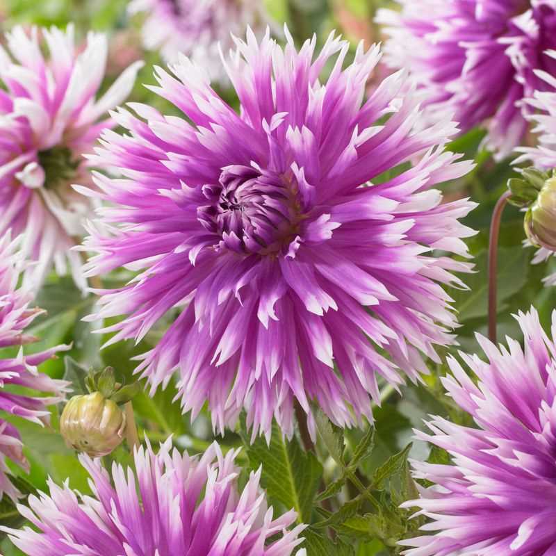 Compact, and full of character, the Table Dancer Fimbriata Dahlia brings a cheerful energy to your summer garden with it's cactus-like blooms. Reaching 6-inch (15 cm) across, the frilly, fully double-pointed petals of vivid purple contrast with its white split tips that elegantly curve backward, producing a unique tubular effect.